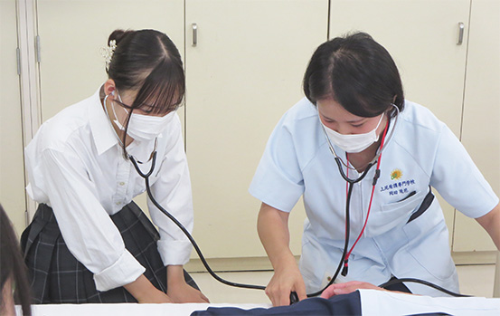 この日の体験授業では、聴診器を使って在校生スタッフやフィジカルアセスメントモデルの心音などを聞いてみたり、血圧の測り方を体験してみたりしました。