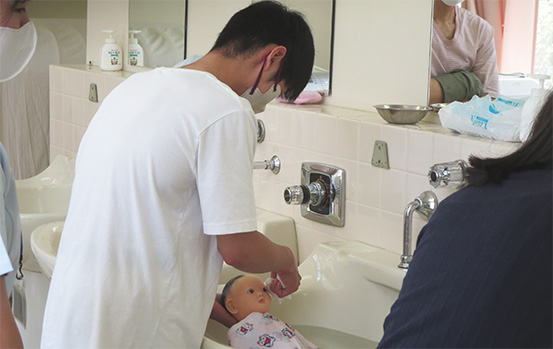 実際の授業でも使用する赤ちゃんモデルを使用した、沐浴体験です。